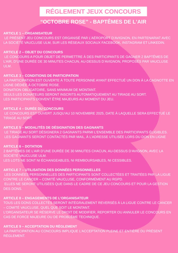 Règlement du jeux – à l’occasion de l’action « Octobre Rose » tentez de remporter 2 Baptêmes de l’air grâce à notre partenaire Vaucluse ULM